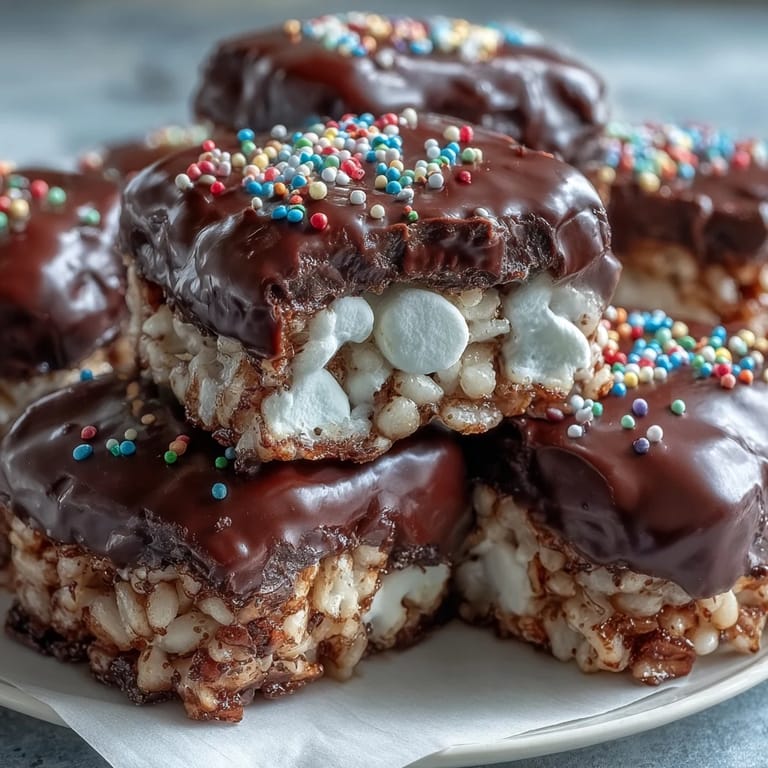 Stirring half a teaspoon of vanilla extract into the melted marshmallows adds a warm, bakery-like aroma that fills your kitchen and deepens the overall sweetness. You can also swap semisweet chocolate for white chocolate and use pastel sprinkles for a springtime or Easter version that looks delicate and tastes surprisingly rich. If you want a grown-up twist, try dark chocolate with a pinch of flaky sea salt on top instead of sprinkles—it's elegant, a little salty-sweet, and perfect for dinner parties.