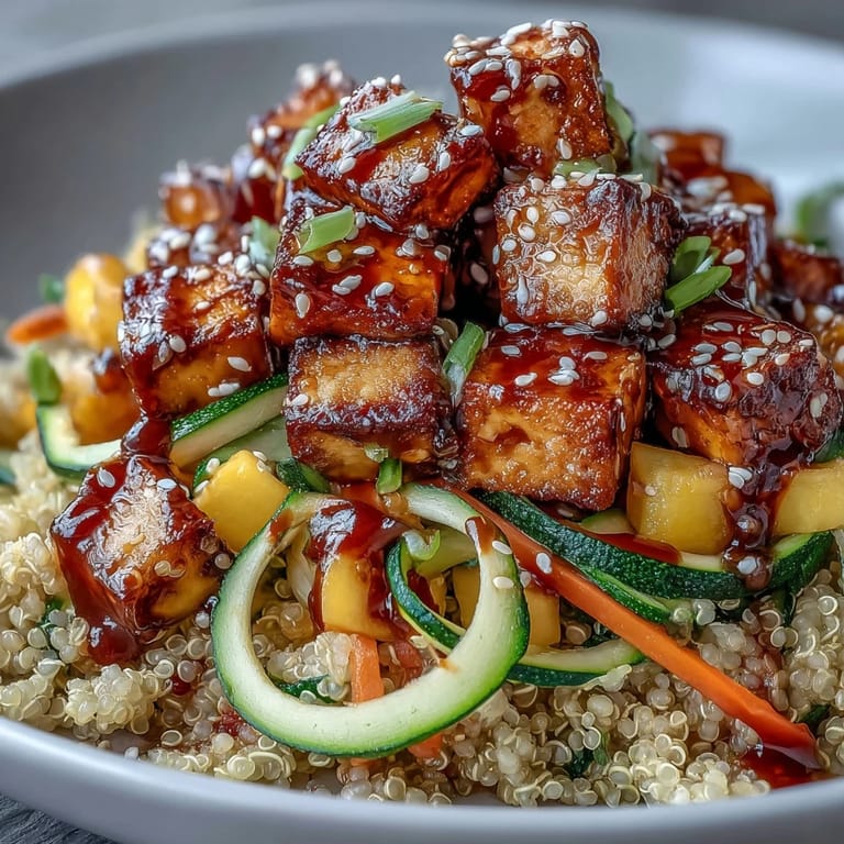 Save One Tuesday afternoon, I was scrambling to put together something that felt both satisfying and light, and I found myself reaching for quinoa, some vegetables I'd spiralized the night before, and a block of tofu sitting in my fridge. The moment that teriyaki sauce hit the pan—that sizzle, that aroma of ginger and garlic mingling with sesame—I knew I'd stumbled onto something special. What started as a weeknight improvisation became the bowl I keep coming back to, the one that somehow tastes like it took hours but never does.