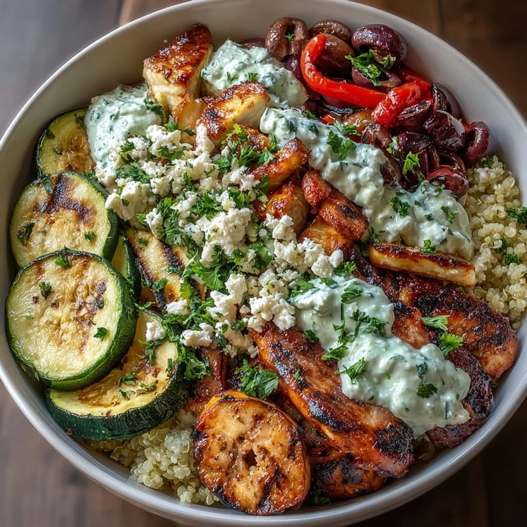 This bowl is actually great for meal prep because everything holds up well in the fridge. I usually marinate the protein and vegetables the night before, then grill everything on Sunday afternoon and store it in separate containers. The quinoa stays fluffy for days, and the tzatziki gets even better after sitting overnight. When I'm ready to eat, I reheat the protein and vegetables in a skillet, then build a fresh bowl with cold cucumber, olives, and feta. It tastes just as vibrant as the day I made it, and it saves me from ordering takeout on busy weeknights.